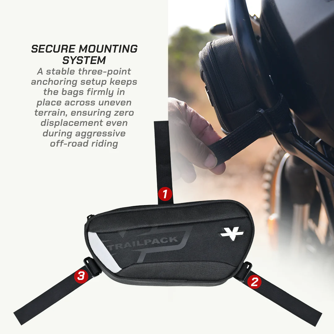 The RE Himalayan 450 TrailPack Lite is engineered for riders who prefer a lighter, more streamlined setup on technical trails. Designed to mount securely on the Himalayan 450’s tank frame, this compact 4L pair offers quick access to essentials like tools, tubes, or spares while keeping weight balanced and the motorcycle’s lines clean. Built with the same attention to detail as the larger TrailPack, the Lite version delivers focused functionality in a smaller, purpose-driven form.